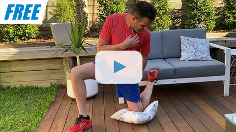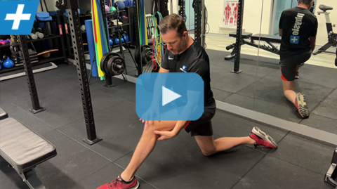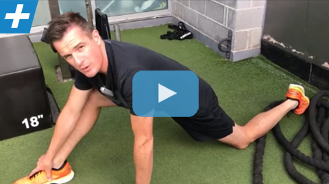| The stretch advances the hamstring mobility by kneeling on the floor and using your body to help stretch. |