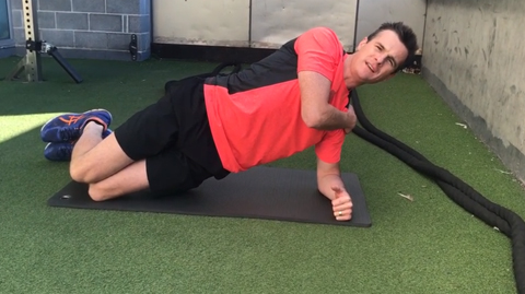 Start in sidelying, leaning on your elbow and forearm. Keep your elbow directly under your shoulder and your knees bend to 90 degreees, and heels in line with your hips. Move your hips into a squat position and tilt the pelvis so your lumbar spine is in neutral and not sagged down. Stiffen and activate the core, grab your shoulder and resist with by pulling backwards.