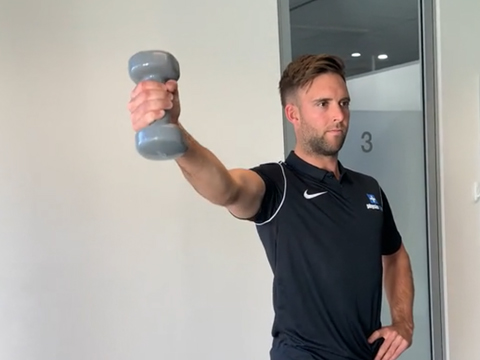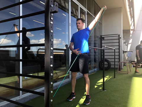 | Loop one end of the band around your foot or a fixed object. On the same side loop other other end around your hand and tighten until there is tension in the band with your arm by your side. Raise you arm straight above so it's in line with your body and keep you elbow straight throughout the movement. Aim to go as high as you can above head towards the floor - without pain. Slowly let the arm return to by your side. |