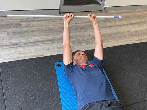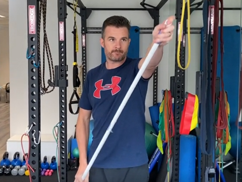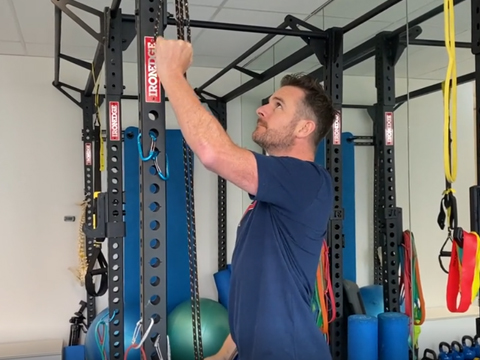 | Loop a rope over a high pole or pulley. Have the rope in both hands to the short end is in the non-affected arm and the long end in the injured / surgical arm. Try to stand under the rope vertically as much as able. Slowly pull down on the rope with the good hand, and lightly gripping the rope with the other - let it move upwards. Go to pain only, don't go into the pain. Slowlyl let the tension off again so the injured arm returns down again. |